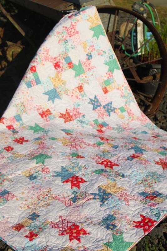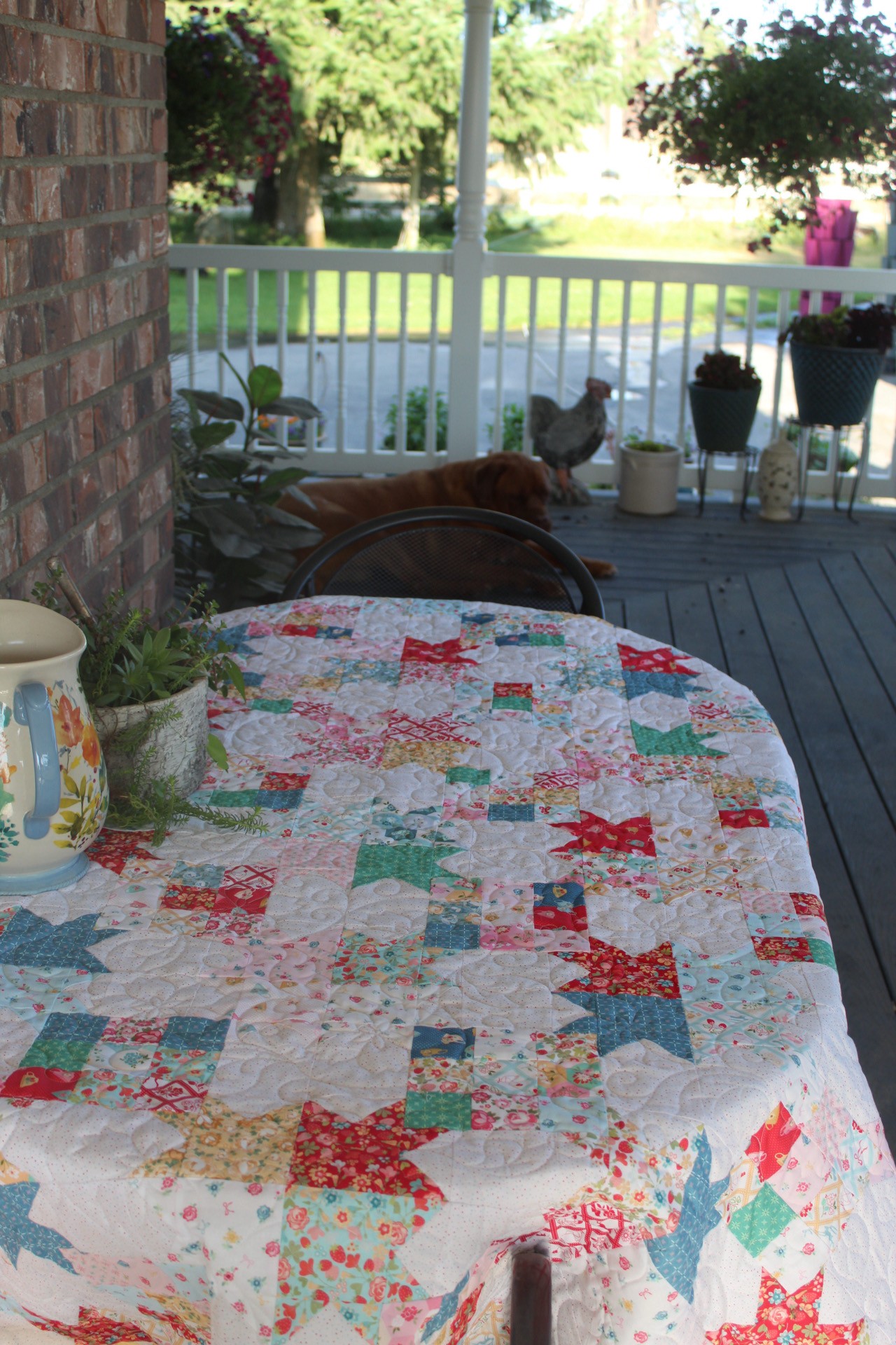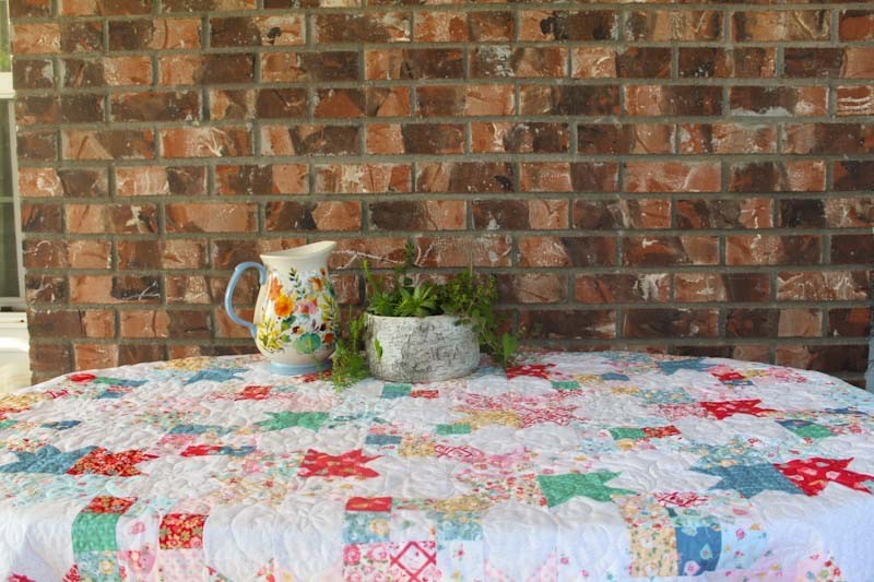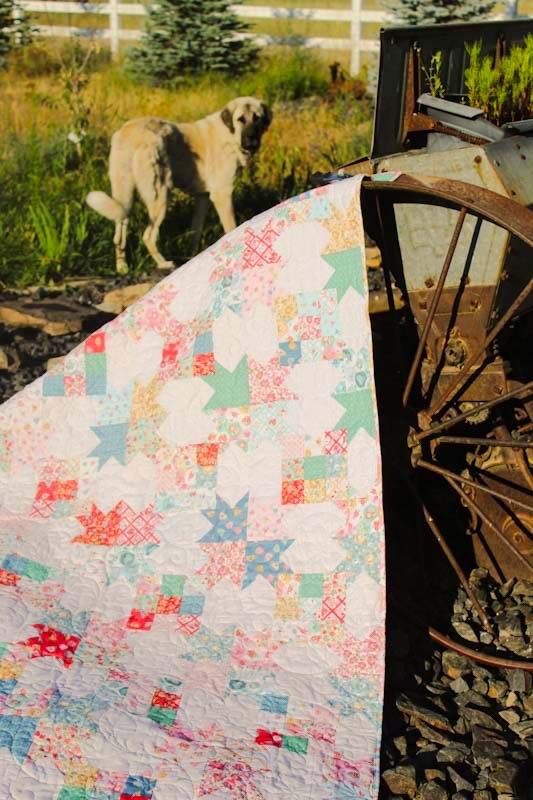 What I love about this line …which is very sweet with so many adorable prints is that once it was cut and put into this design it really made it look very vintage. I wasn’t feeling the vintage kind of vibe before seeing it in this pattern. But after sewing it all up into this quilt it was really giving me those serious picnic-on-the-porch-in-the-middle-of-summer-vibes.