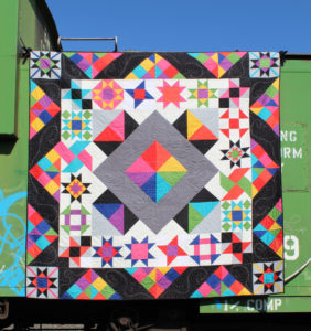 I was so excited that my son was home this particular weekend because I could have him climb on top of that train car and hang the quilt. For some reason my husband wouldn’t do that. LOL